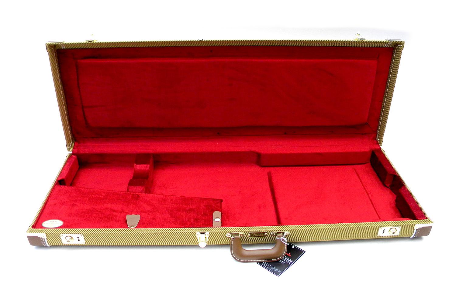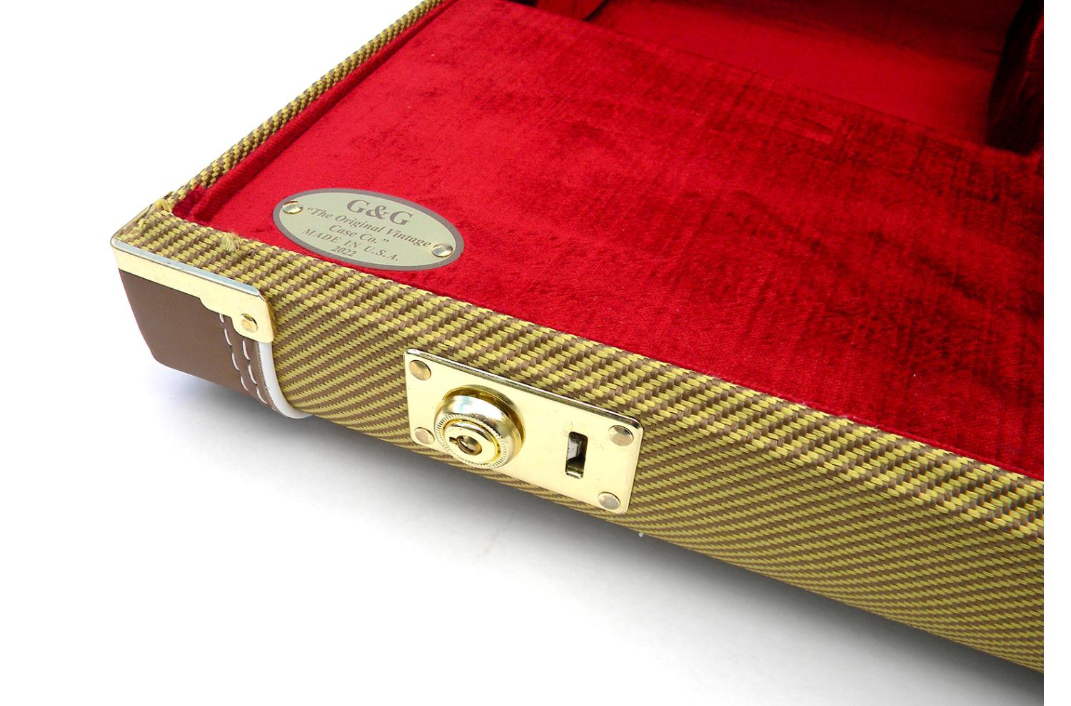 Fender G&G Deluxe Tweed Hartschalenkoffer/Box, Holzgehäuse mit Tweedstoff bezogen, vintage Stil, Zeitraum 1954/1960. Roter Satin-Kurzflor-Baumwollsamtstoff mit burgunderfarbenen Akzenten, sehr elegant und passend zu echten vintage -Gehäusen, Messingscharniere mit Schlössern.