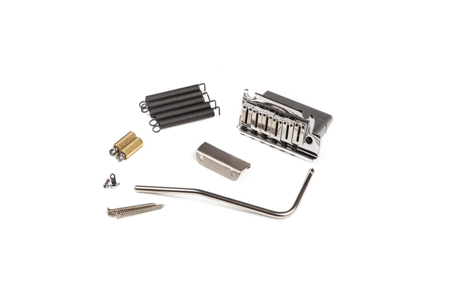 Tremolo der Fender Stratocaster Deluxe- oder Elite-Serie, verchromte Edelstahlsättel, Hardware, Kamm, Drehpunkte, Saitenführung, Federn und Tremoloarme, verchromte Sättel, Lichtblock, aufsteckbarer „Popin“-Arm, Inbusschlüssel .