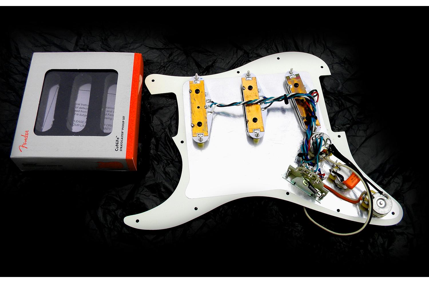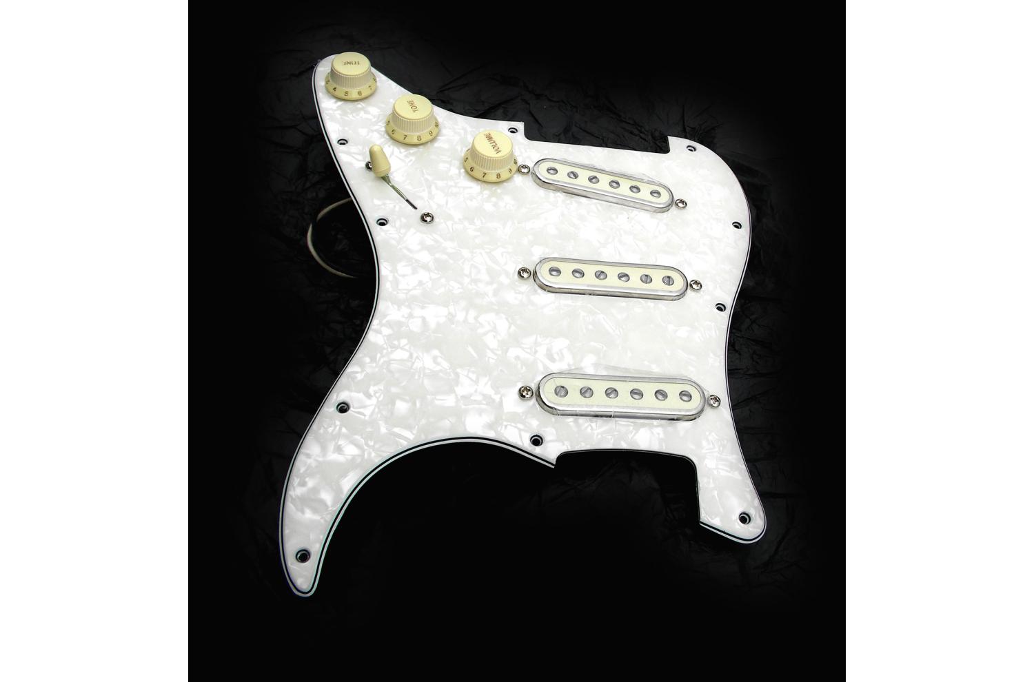 Geladenes Schlagbrett Fender Strat® CuNiFe™ Aged Pearl Pickups mit Blender: 4-lagige parchment white Perlmuttplatte, zusammengesetzt mit den neuen Fender Strat Cunife Pickups , entworfen von Tim Shaw, einem der besten Strat® Pickup-Sets überhaupt: Die Kraft und Qualität der gestapelten Humbucker, die den Druck, die Präzision und vintage Mitteltonbereich bieten, die wir lieben, und das alles mit unübertroffener Kraft und Finesse. INDIVIDUELLE MONTAGE AUF PICKGUARD UND TASTEN IHRER WAHL!!