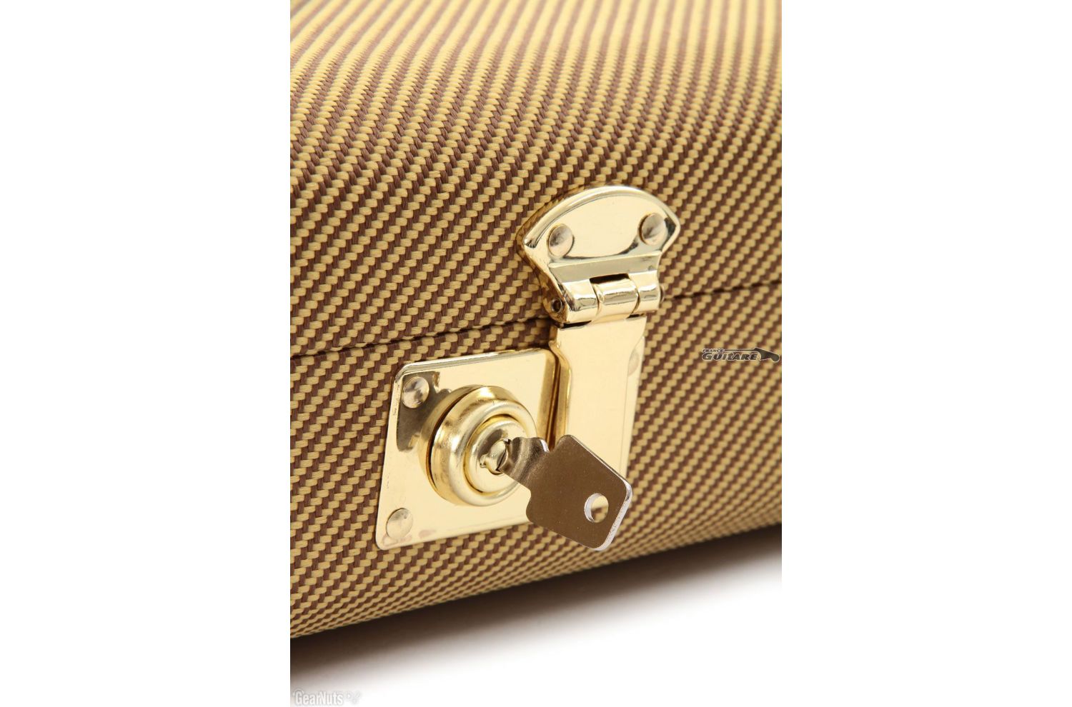 Fender G&G Deluxe Tweed hard case/box, wooden shell covered with Tweed fabric, vintage style, period 1954/1960. Red satin short-pile cotton velvet fabric filling with burgundy highlights, very elegant and consistent with real vintage cases, brass hinges with locks.