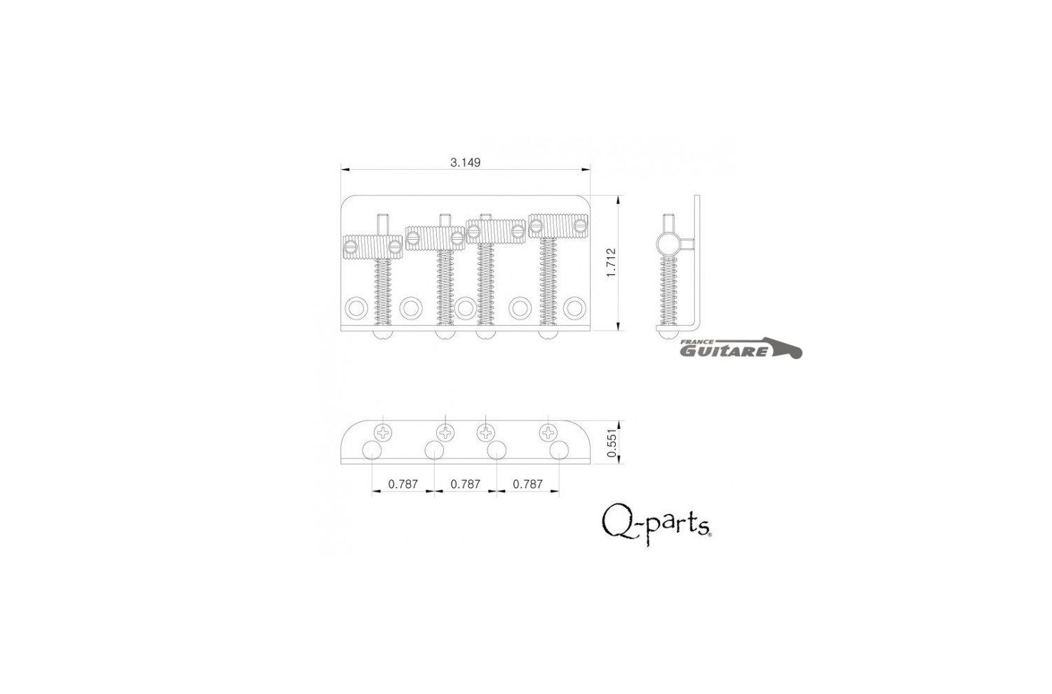 Q-parts vintage aged relic Jazz and Precision Bass Fender® made in the USA 60's style bridge tailpiece for 4-string bass guitar, 5 mounting screws on the top, "medium relic" level patina finish.