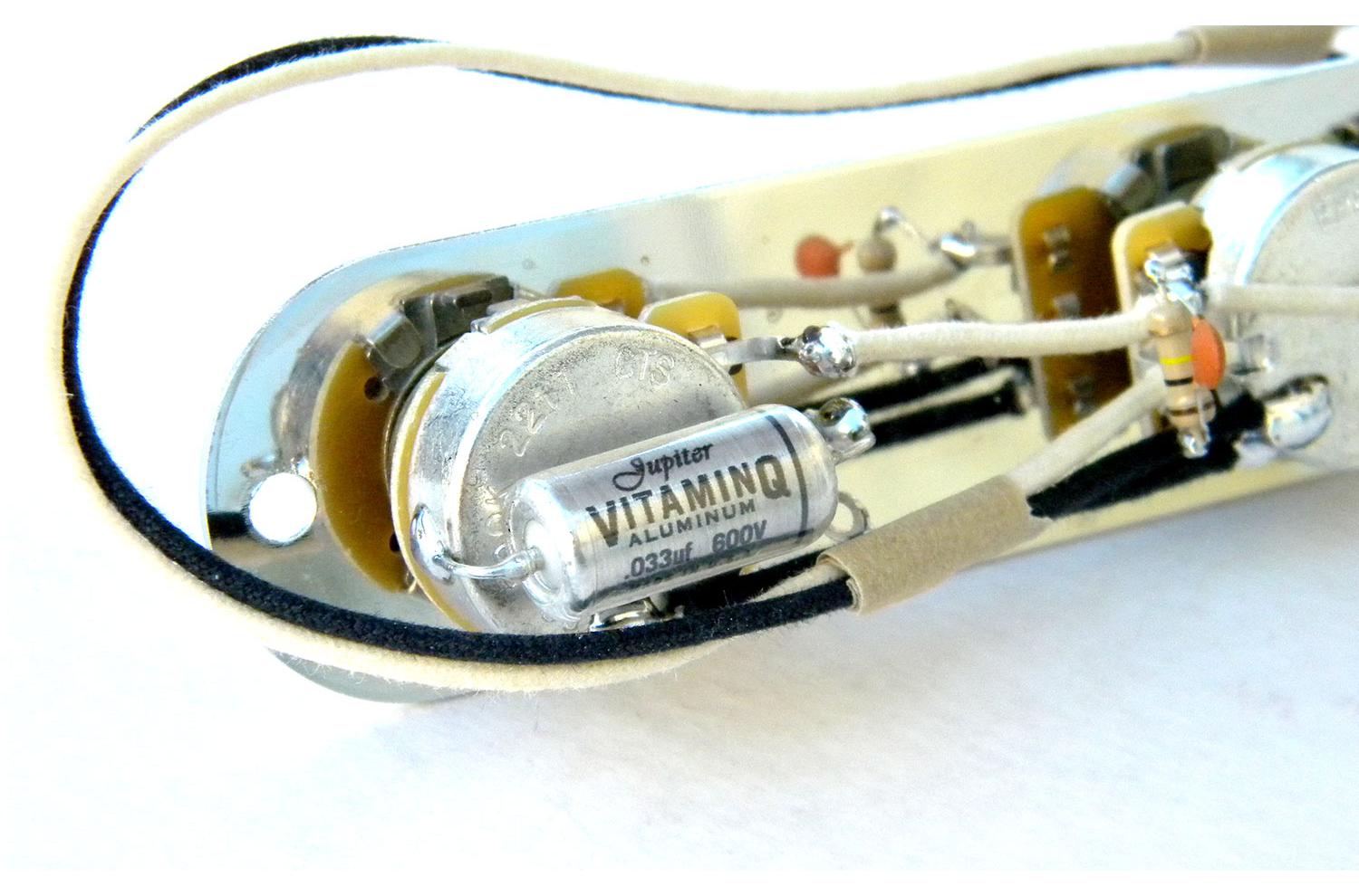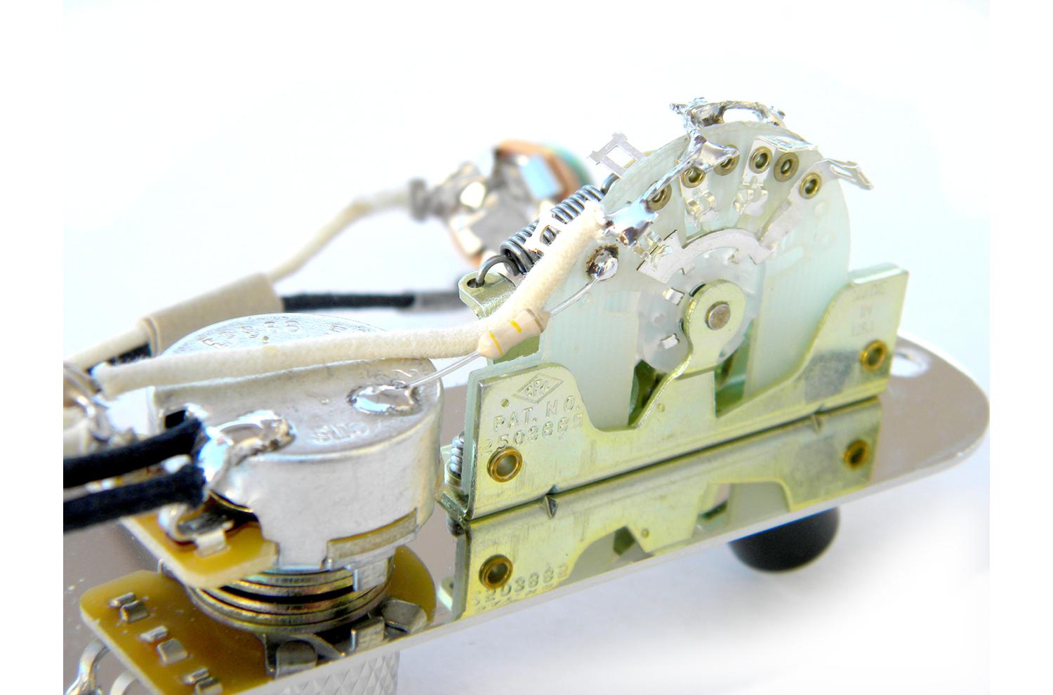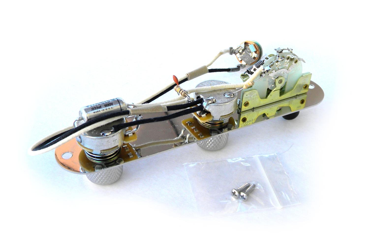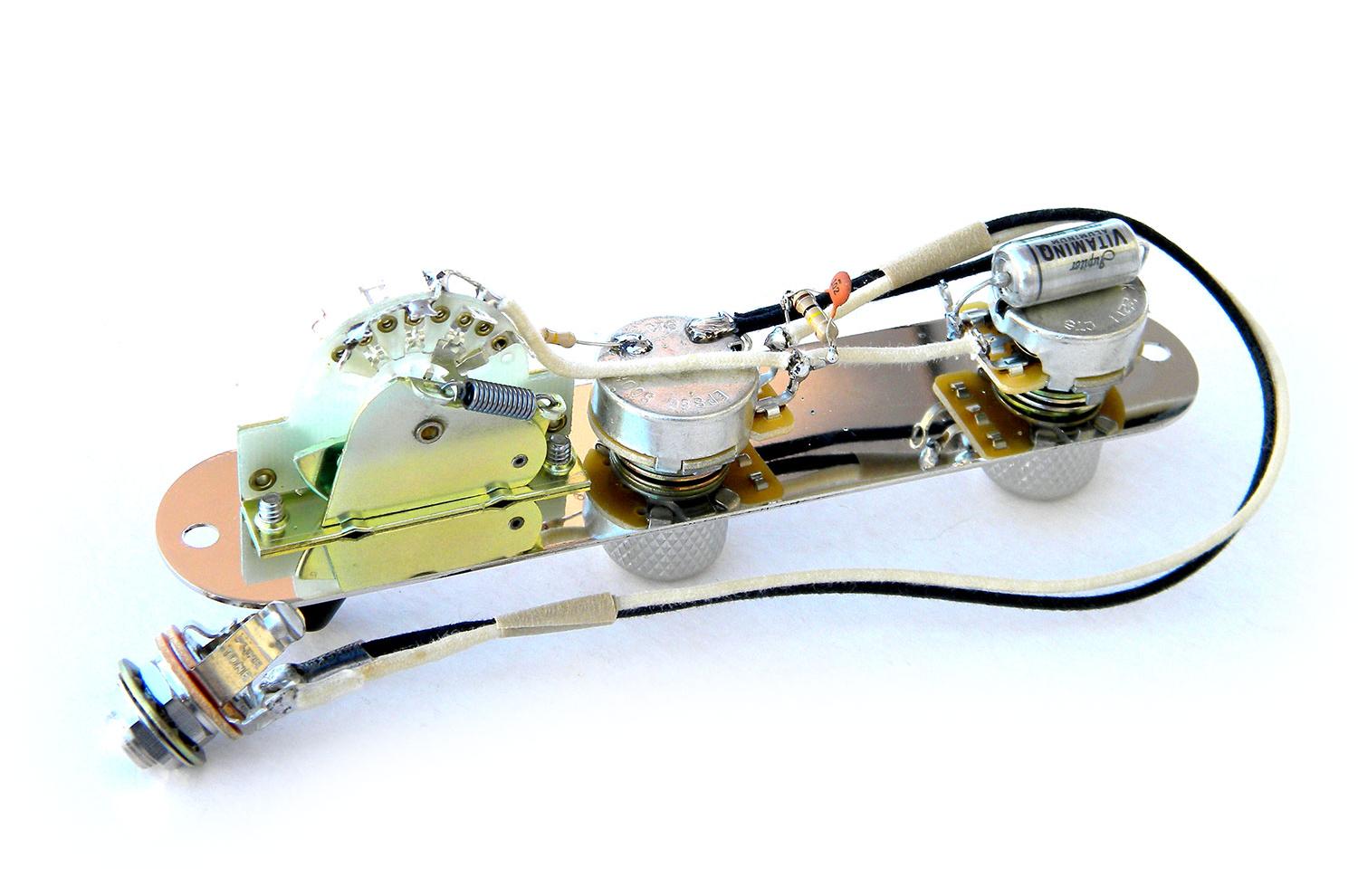 Prewired Telecaster 3-position plate for combination of Humbucker and single pickups in SH or HH mode: CTS 500K audio/log, treble-bleed, vitamin-Q oiled paper condenser, pure-tone full contact jack, control plate for any Fender Telecaster USA /Mexico/Japan.