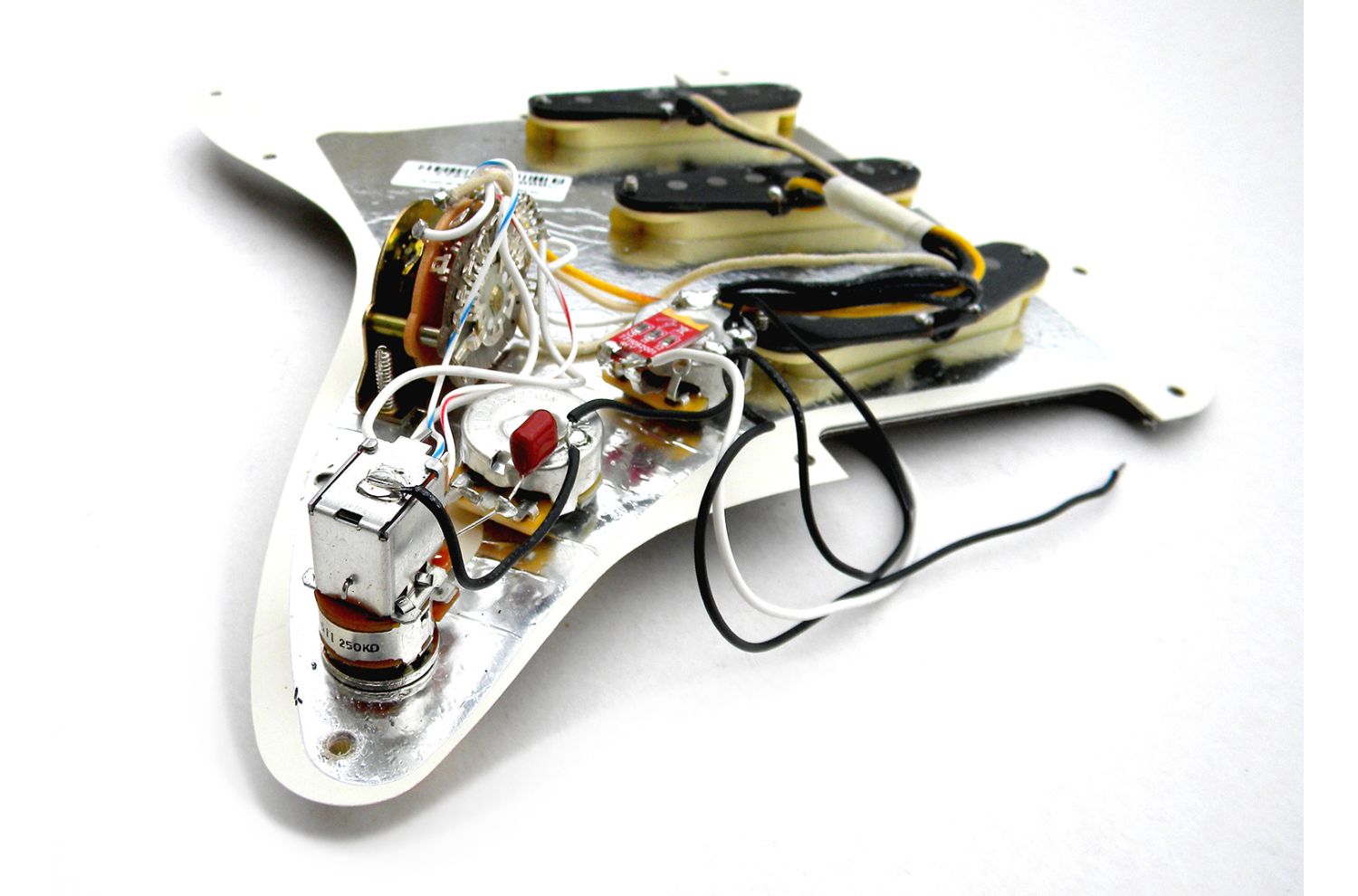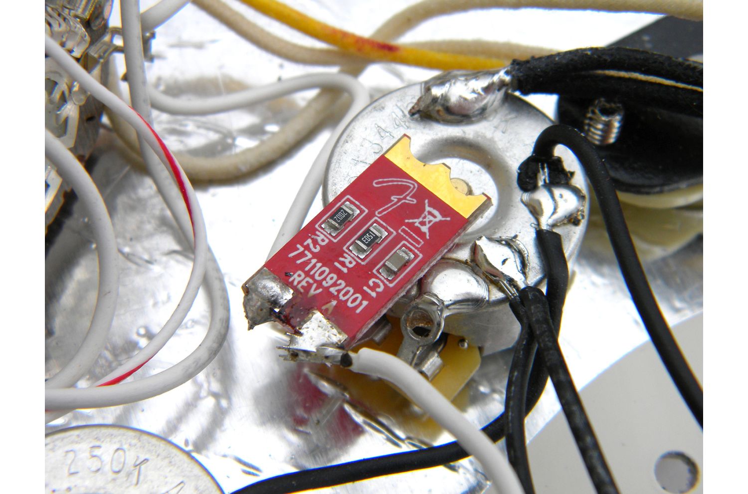 Modern American Professional Series 2 wiring with treble bleed on volume, vintage CTS Fender® 250K electronics in tone and volume, .022uf/250V Mylar capacitor, Grisby double wafer 5-position selector in parallel.