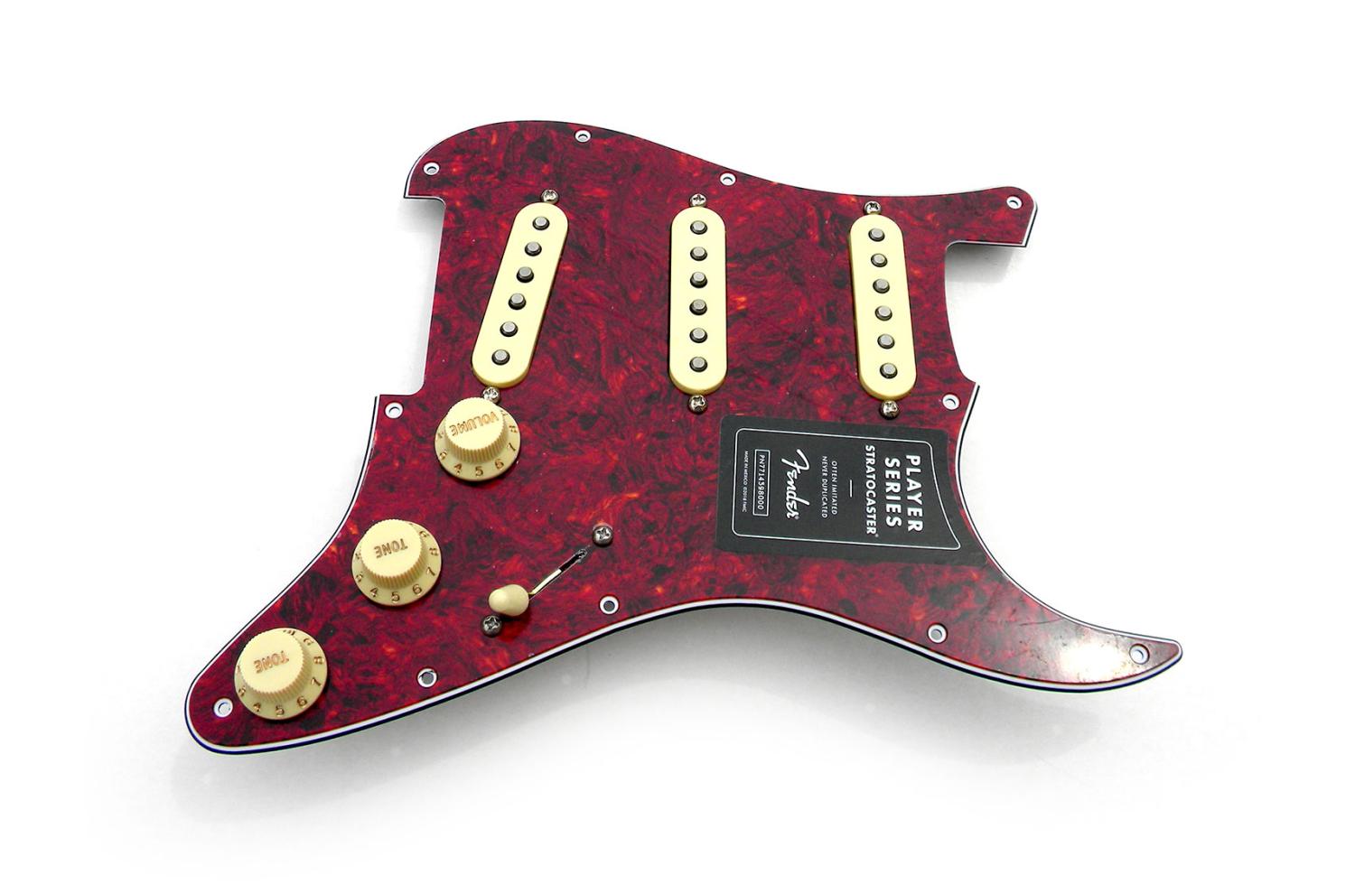 Loaded Pickguard Fender Stratocaster Player FSR Red Tortoise 3 ply made in Mexico, plate and buttons and aged white plastics, V-mod style pickups limited edition Player Series powerful very rock, CTS 250K electronics, 5 position selector.