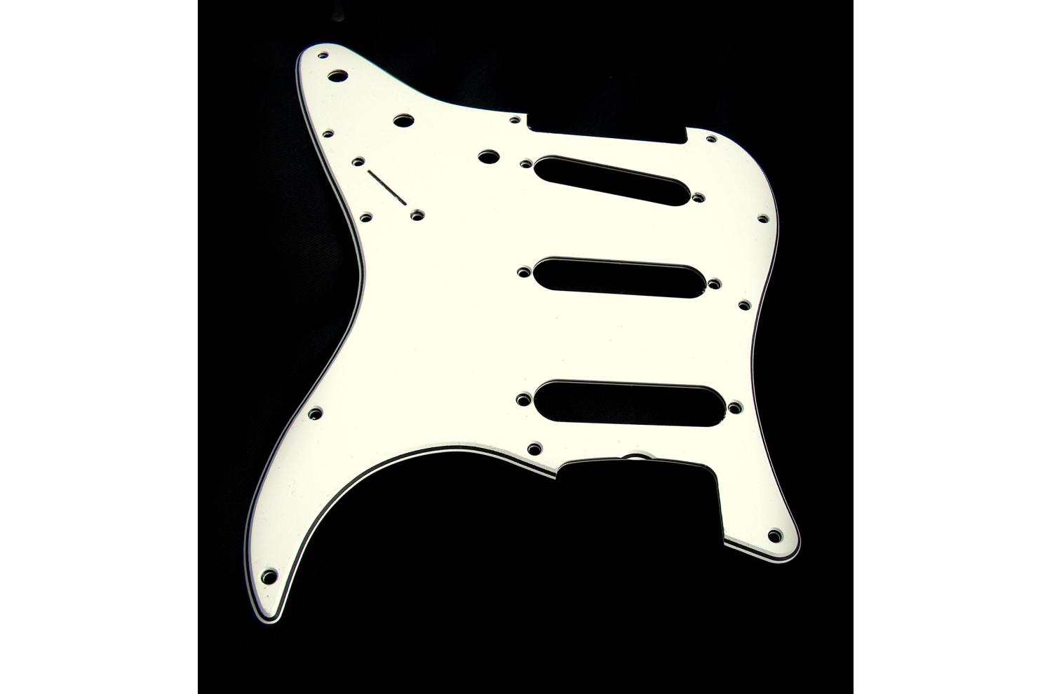 Fender Strat American Vintage 65 celluloid pickguard 11 holes, 3 ply off-white Eggshell type, black net, trussrod screw access cutout, thickness .090, no conductive film on the back of the plate.