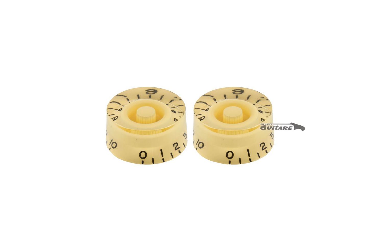 Pair of Speed Knob Vintage cream knobs with black lettering for Fender and Gibson guitars: Transparent plastic knob, cream background and black lettering. For use on potentiometers made in USA or made in Mexico in 24 lines.