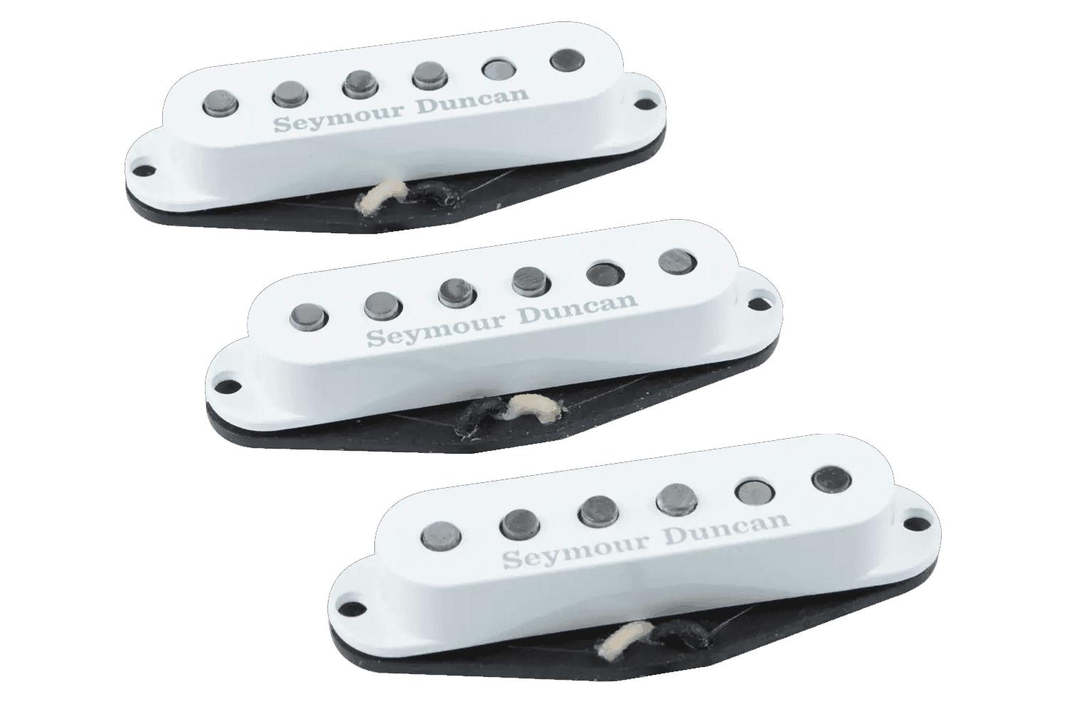 The Seymour Duncan California 50′s classic SSL-1S Stratocaster Pickups are among the best replacement pickups for a vintage fifties Strat® sound, with power and precision. Set of staggered magnet pickups, with a central pickup with reversed coil and polarity, and white covers ( Seymour Duncan 11208-01).