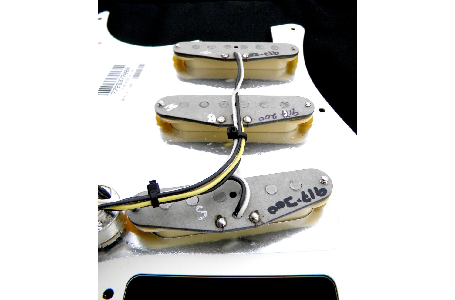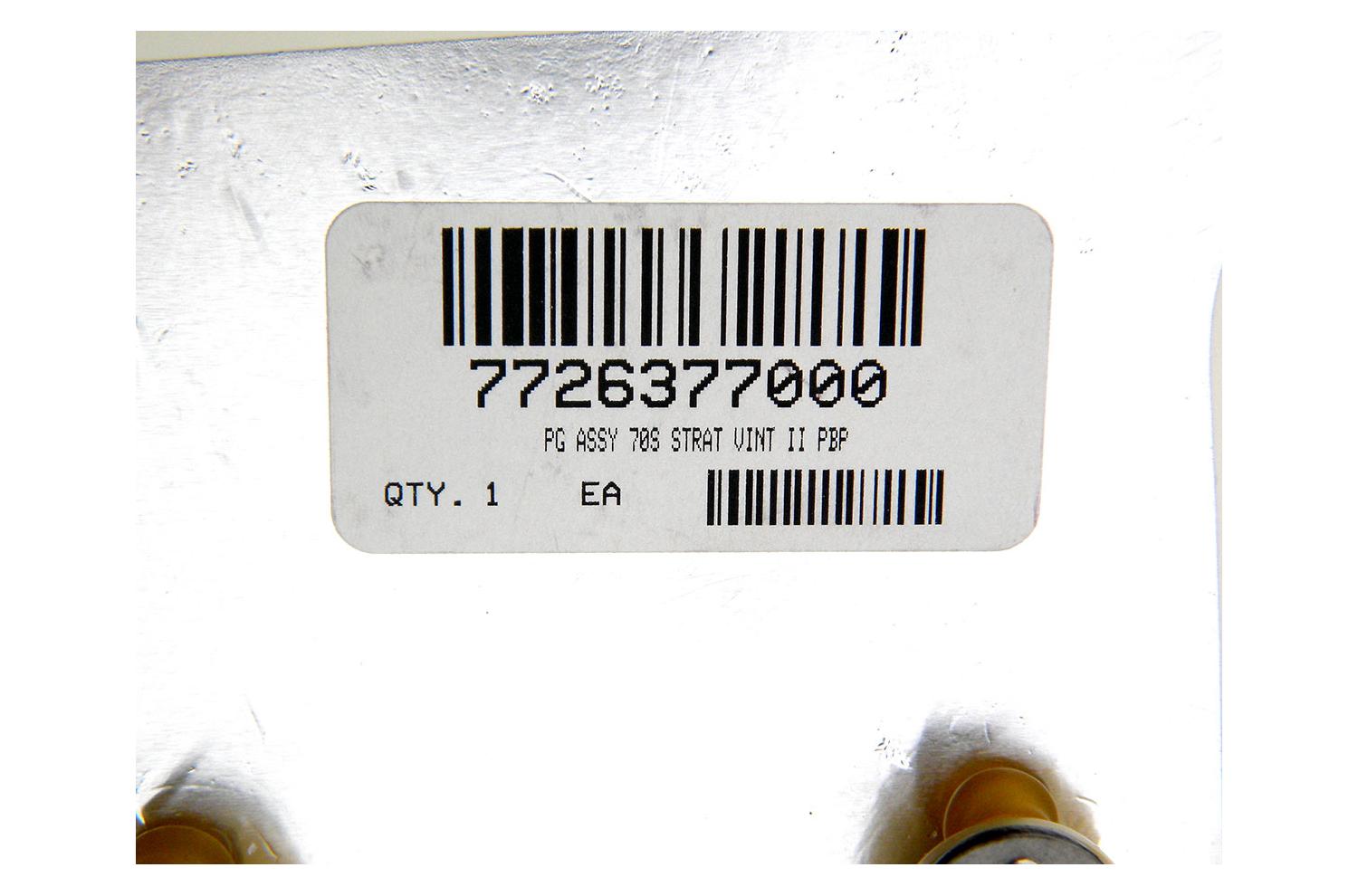 Golpeador cargado Fender Strat® 70's Vintera 2 Parchment White ensamblado equipado con el juego de pastillas Fender Vintera 70 equivalentes a las Pure Vintage 73 pero menos potentes, con bobina de fibra gris encerada "waxpot", devanado fino de cobre oscuro malva-burdeos tipo AWG-43. Sonido cálido y claro, cristalino, graves redondos presentes, muy buenos sonidos claros. Imanes Alnico de 5 pasos.