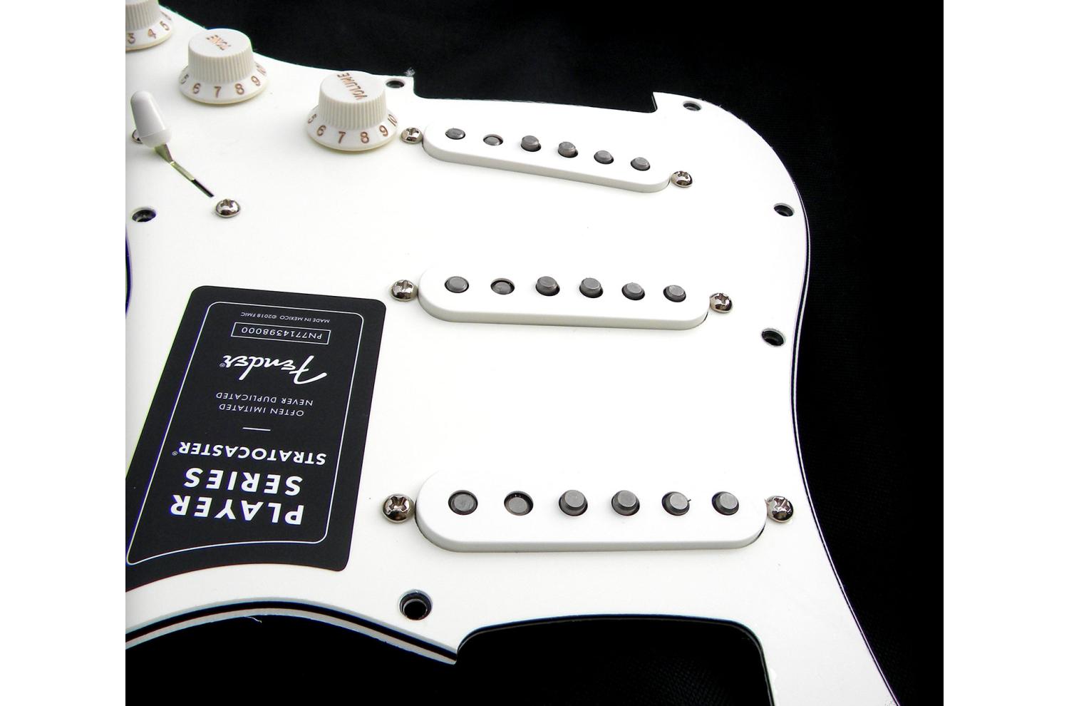 Pickguard cargado Fender Strat Player series 70th anniversary limited edition 2024 equipado Fat 50's: Relación calidad-precio inmejorable para esta placa FSR Anniversary Player Series Limited Edition ensamblada en serie en México con una selección de pastillas Fat 50's Alnico 5 calibradas para una combinación estilo años 50: fresno Cuerpo, mástil mástil de una sola pieza.