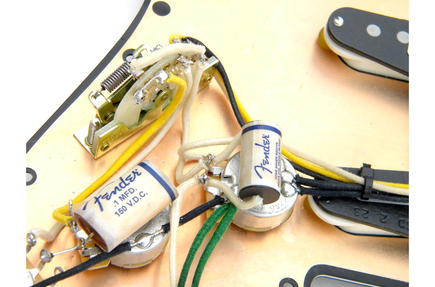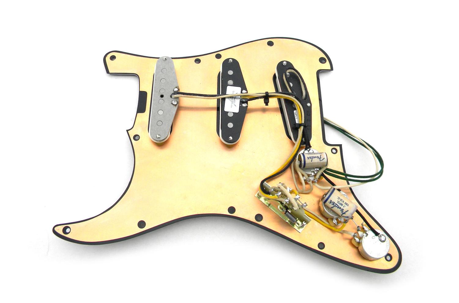 Golpeador cargado Fender Strat® tipo 1963 híbrido balanceado equipado con una pastilla de mástil Fender pure vintage 65, una Fender Fat 50's (RW/RP) en el medio y una pastilla de puente Alnico2 de polo plano Seymour Duncan APS2, CRL fabricada en usa USA de 5 vías selector, Fender PIO .1uf/150V y protector de tono de sangrado de agudos 250K, placa negra de 3 capas tipo 1962, accesorios parchment white .