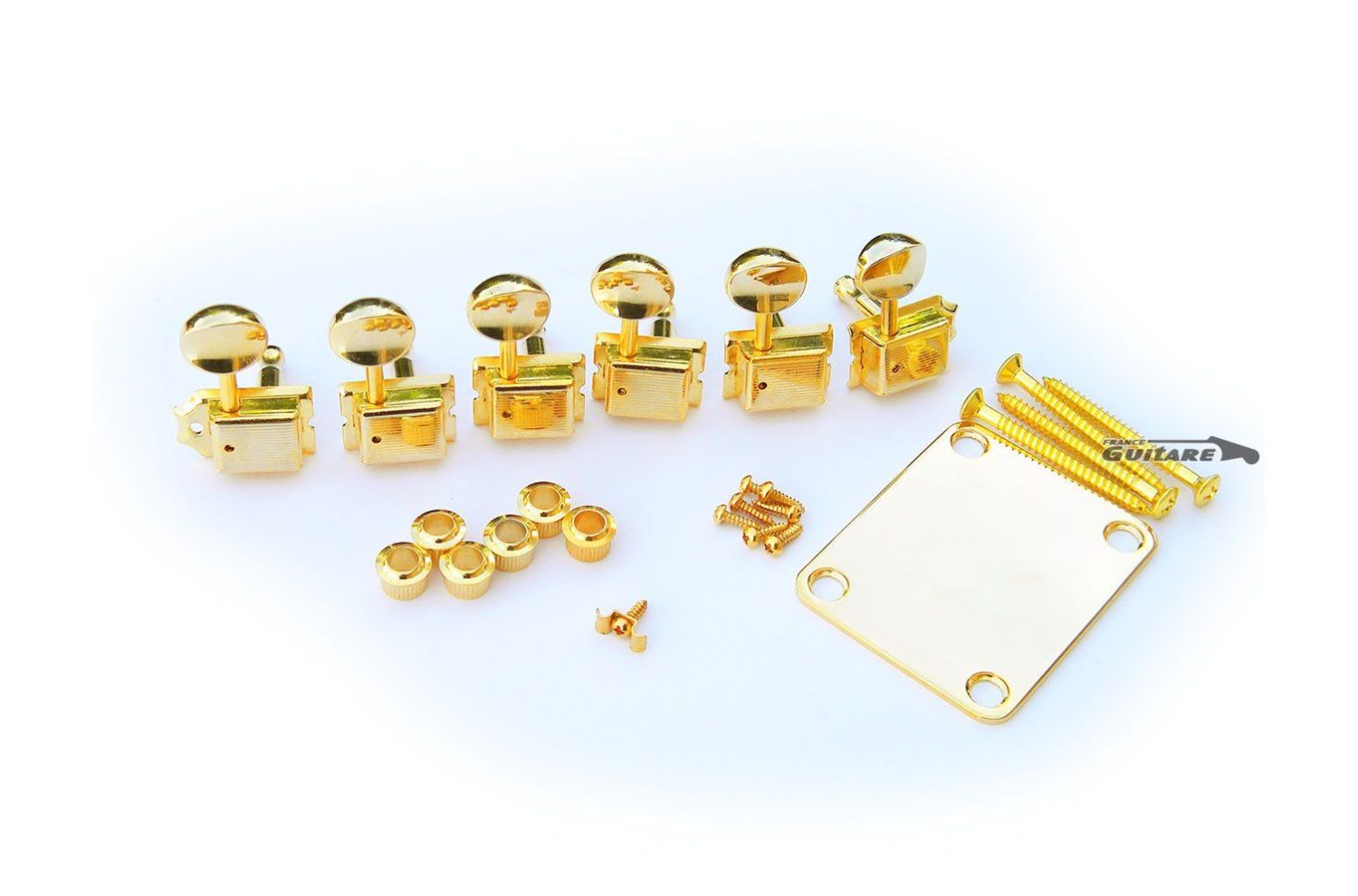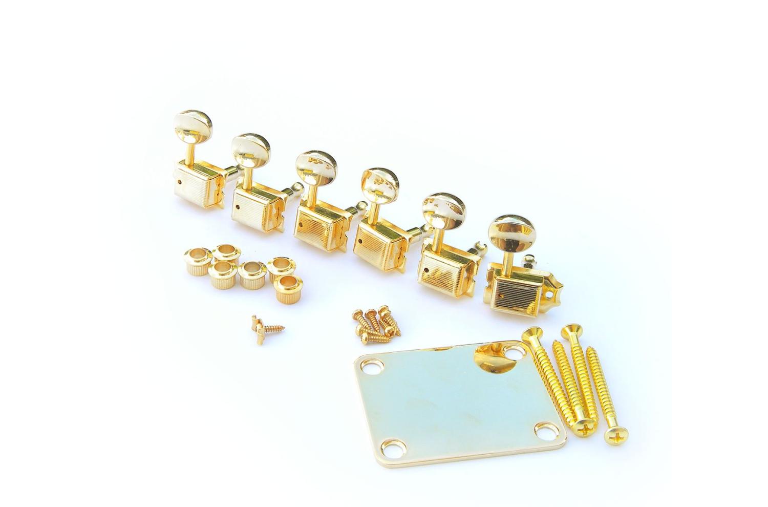 Fender Classic Vintage mástil Guitar Neck Hardware Kit, piezas de hardware doradas para el montaje en el mástil de Strat®, Tele®, Jaguar , etc. Gama Classic Mexico, Classic Player, Deluxe, Deluxe Player, etc. Piezas originales Kluson / Gotoh .
