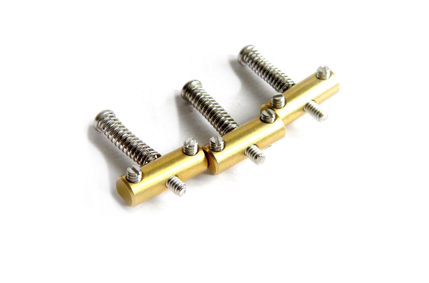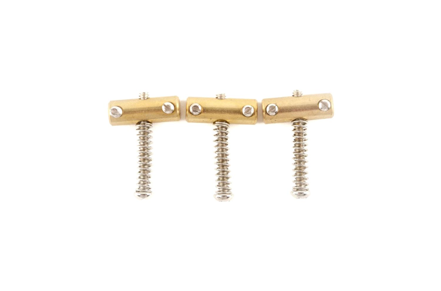 Sillines cilíndricos compensados Fender Telecaster® Broadcaster vintage USA Brass® . Selletas de puente para puentes vintage años 50 y 60: se entregan con selletas, tornillos de ajuste (altura y paso) y resortes de montaje, ancho de selletas = 21 mm.