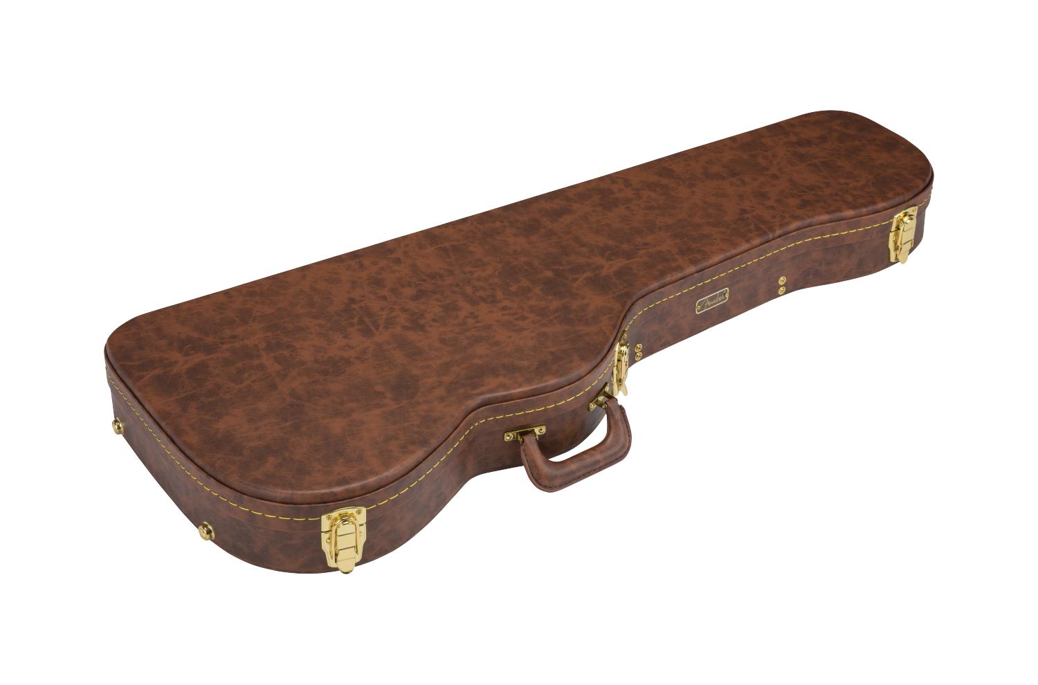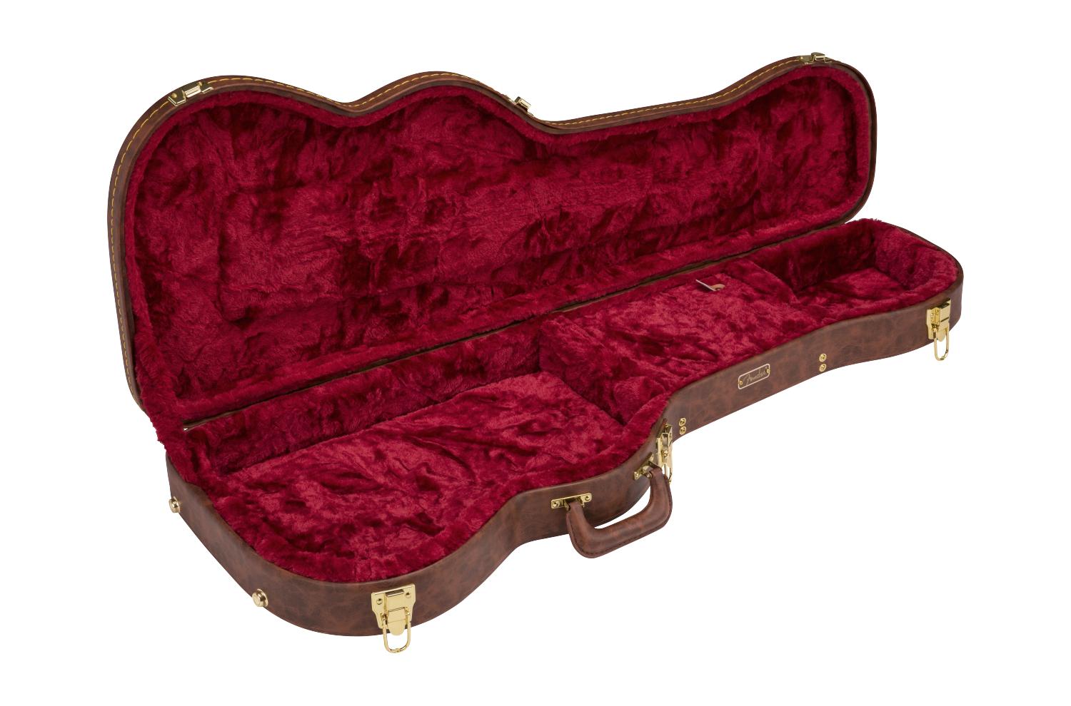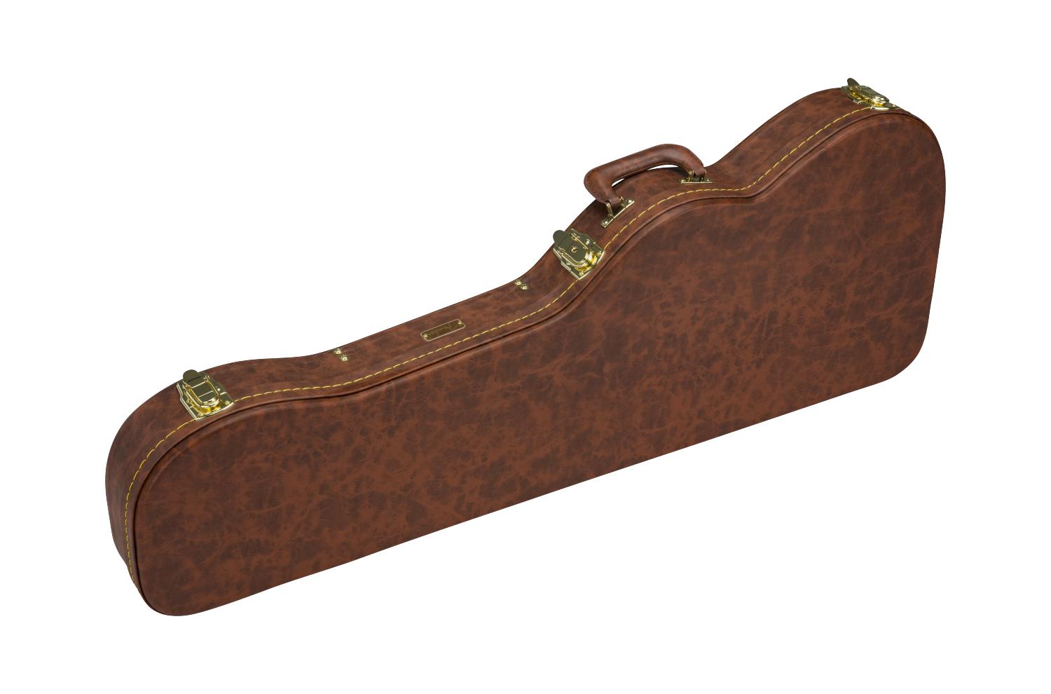 Etui Fender Stratocaster Poodle Case style 1954 cuir vieilli marron, étui reproduction période 50's, coque bois couverte d'un similicuir marron marbré, intérieur renforcé mousse haute densité avec fourrure rouge.