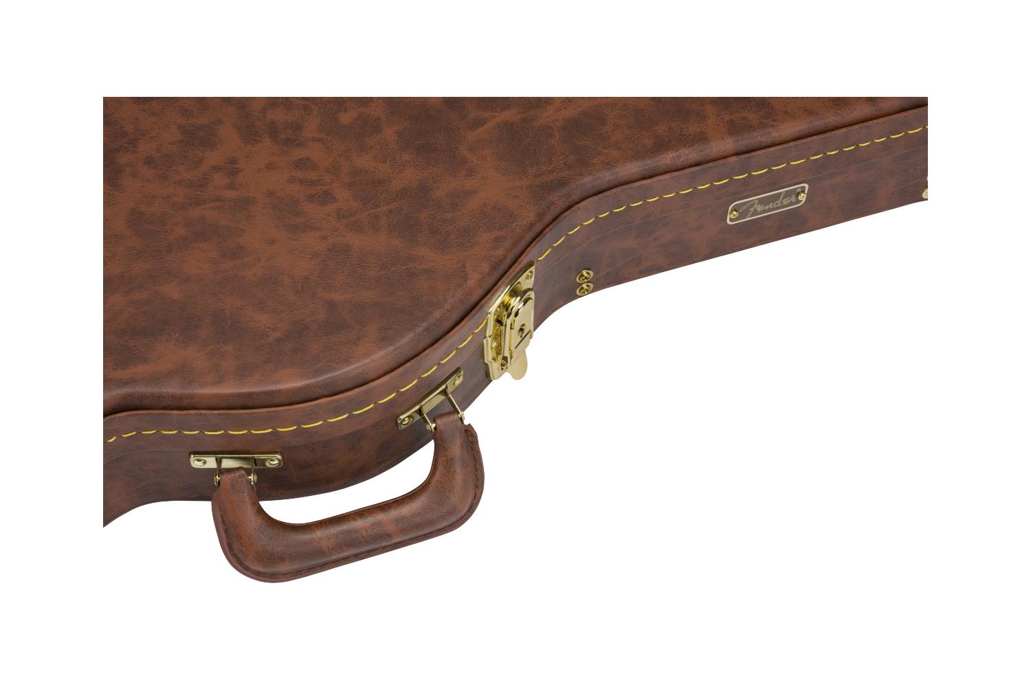 Reproduction moderne de l'étui de Strat® rigide coque bois emblématique "Poodle" de 1954. Fabriqué en contreplaqué de bouleau et recouvert d'un superbe cuir de vachette vieilli marbré avec accastillage doré pour un attrait classique vintage, cet étui au profil mince peut être facilement rangé dans de petits espaces lorsque l'espace de stockage est réduit.