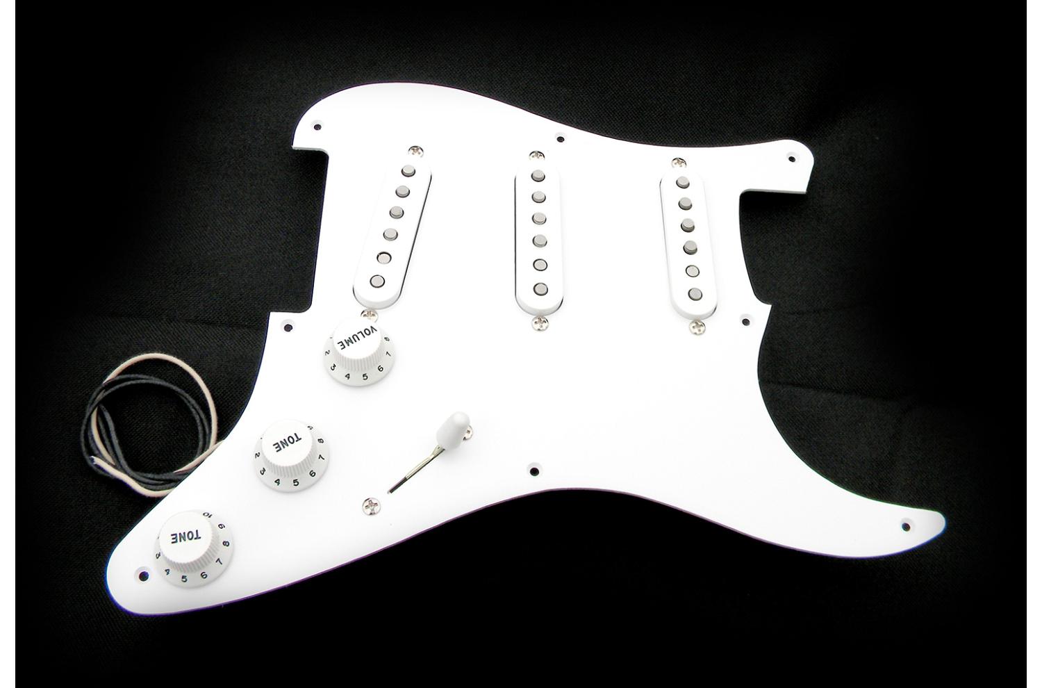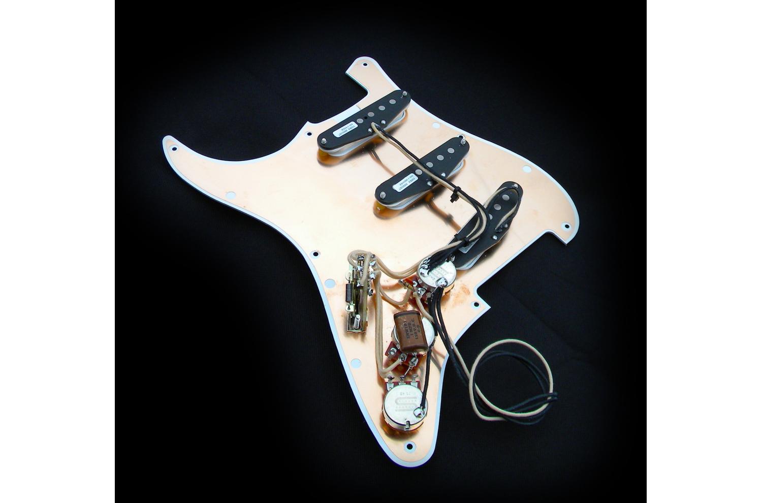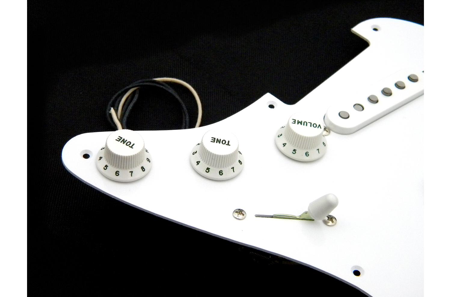 Loaded Pickguard Seymour Duncan Stratocaster California 50's SSL-1 : Exemplaire unique, monté sur pickguard Fender style 1954/1957 blanc brillant vintage à 8 trous, isolé par une plaque cuivre collée, pickguard une seule épaisseur 1,65mm. Compatible toute Strat® type 50's à 8 trous. Sélecteur 5 positions Fender CRL USA, potentiomètres haut de gamme Seymour Ducan "smooth turning Low Friction 250K audio/log", le tout équipé d'un treble bleed sur le volume et d'un super condensateur papier huilé reproduction des véritable vintage Cornell Dubilier "brown chicklet" à feuilles d'aluminium.