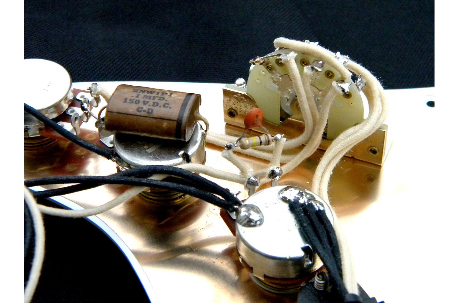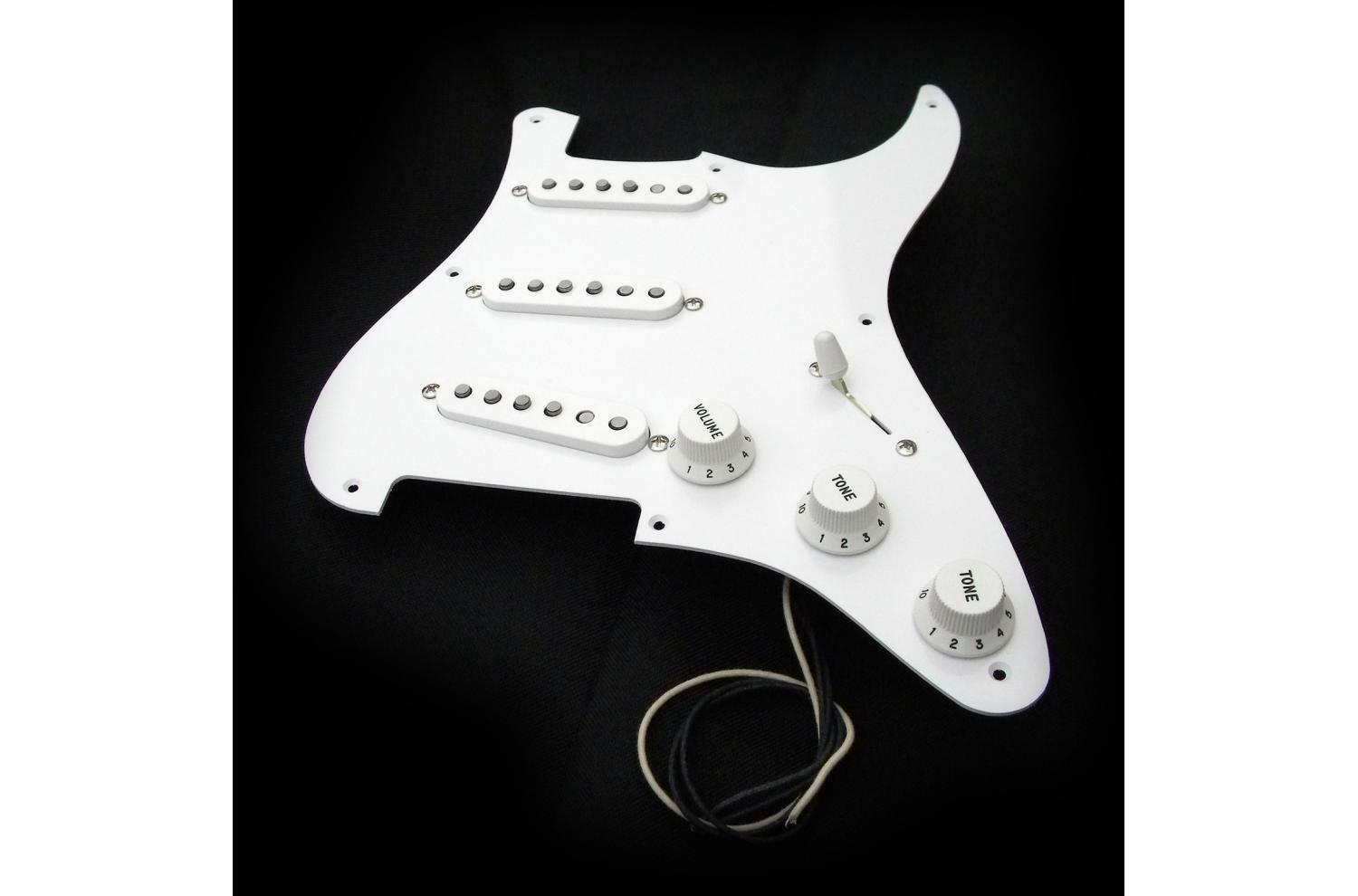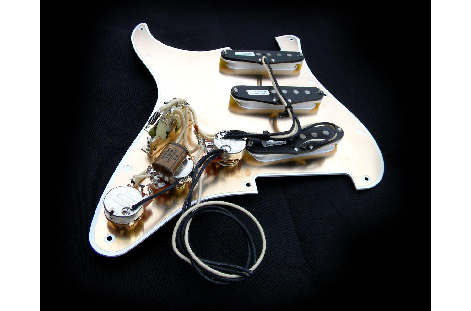 Loaded Pickguard Seymour Duncan Stratocaster California 50's SSL-1 : Exemplaire unique, monté sur pickguard Fender style 1954/1957 blanc brillant vintage à 8 trous, isolé par une plaque cuivre collée, pickguard une seule épaisseur 1,65mm. Compatible toute Strat® type 50's à 8 trous. Sélecteur 5 positions Fender CRL USA, potentiomètres haut de gamme Seymour Ducan "smooth turning Low Friction 250K audio/log", le tout équipé d'un treble bleed sur le volume et d'un super condensateur papier huilé reproduction des véritable vintage Cornell Dubilier "brown chicklet" à feuilles d'aluminium.