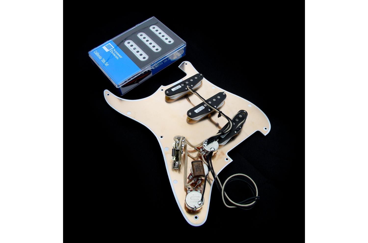 Loaded Pickguard Seymour Duncan Stratocaster California 50's SSL-1, monté sur pickguard blanc brillant vintage un pli fin à 8 trous style 1954/1957 avec isolation cuivre, sélecteur 5 positions, potentiomètres 250K low friction Seymour Duncan, treble bleed, condensateur reproduction Cornell Dubilier papier huilé .1uf/150V