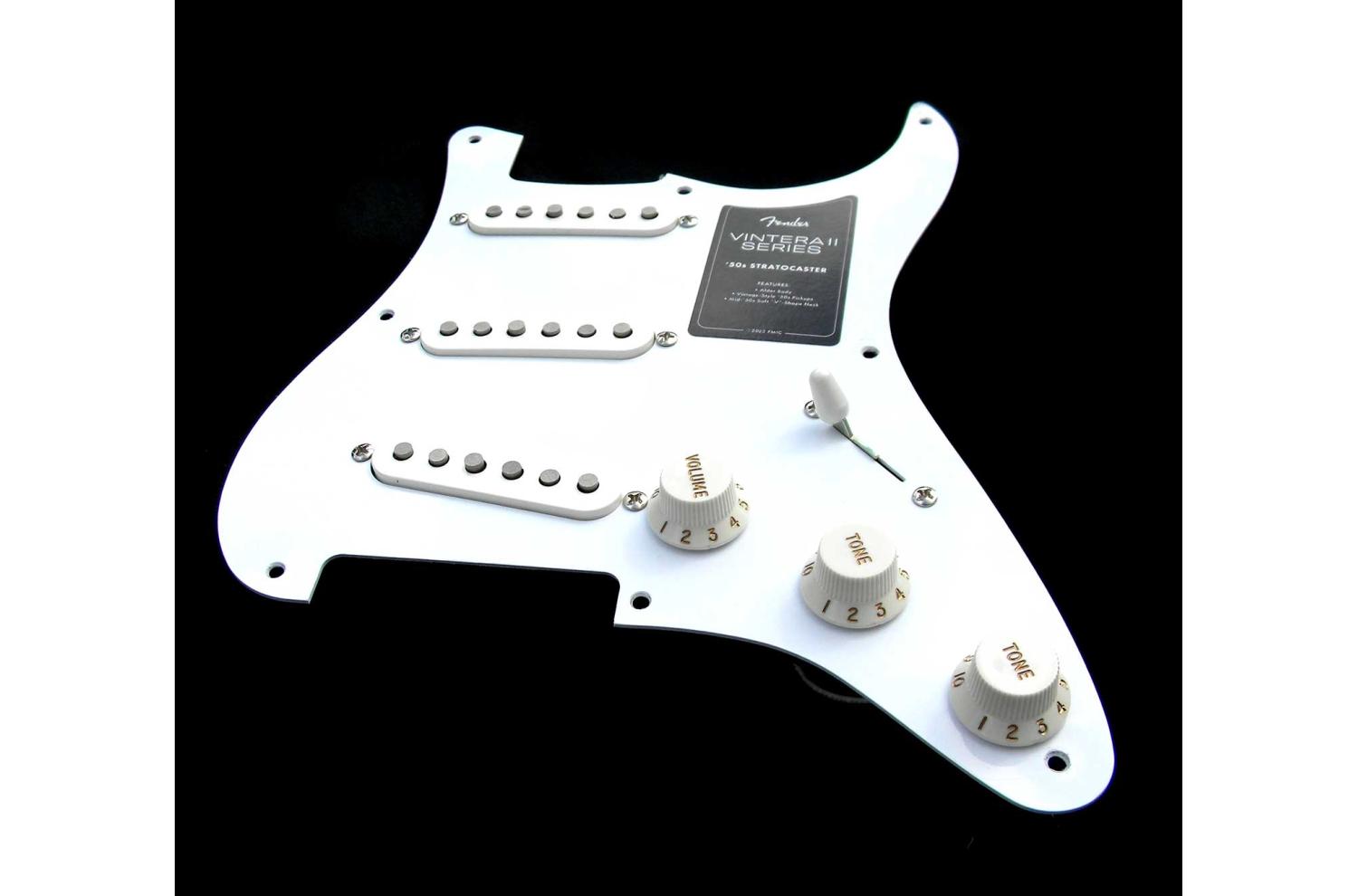 Loaded Pickguard Fender Vintera II Stratocaster 50's Parchment white nouvelle série, micro du type pure vintage 1954/57, plaque 1 pli eggshell blanc cassé à 8 vis, boutons et plastiques parchment white, électronique CTS, sélecteur 5 positions Grisby