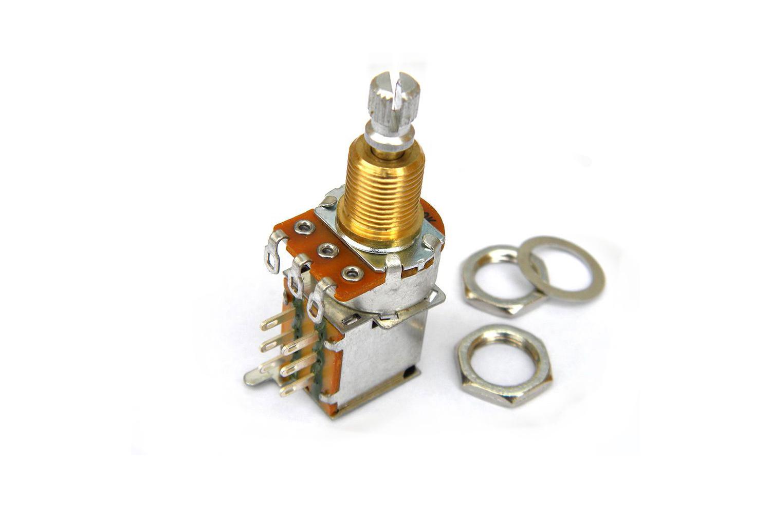 Potentiomètre audio/log Bourns USA type push-pull manuel, axe fendu pour guitares et basses Fender®, montage en volume ou tonalité. Pièce électronique vendue à l'unité, livré avec écrou et rondelle plate de serrage.